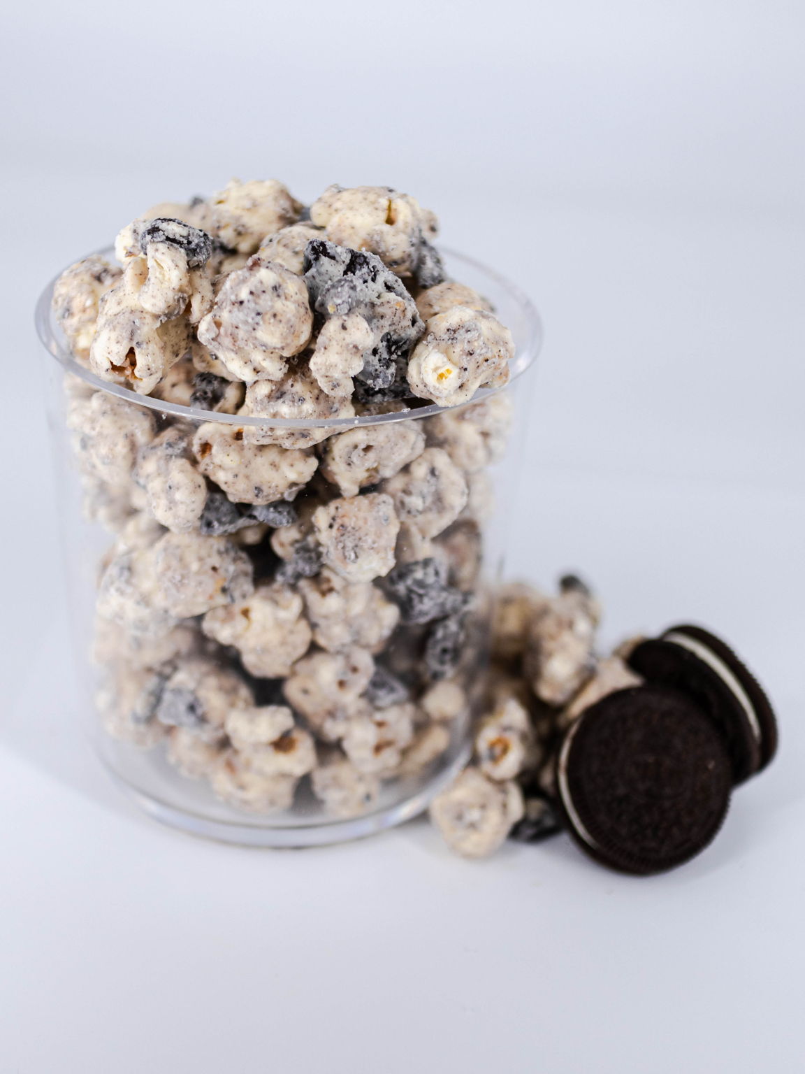 Vanilla popcorn blended with creamy white chocolate and gluten free Oreo cookies