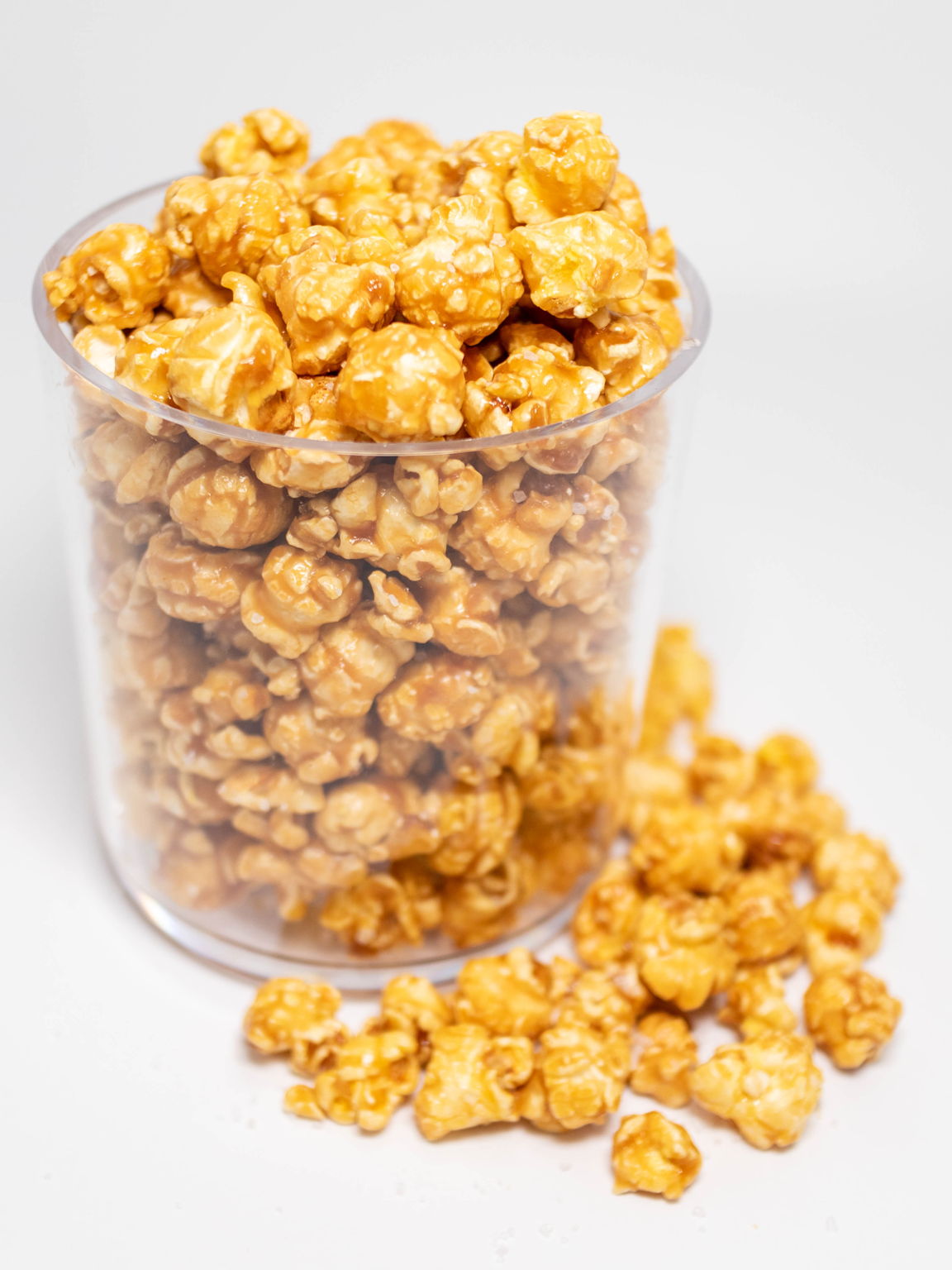 Carmel corn popped with coconut oil and fine sea salt and then sprinkled with coarse sea salt